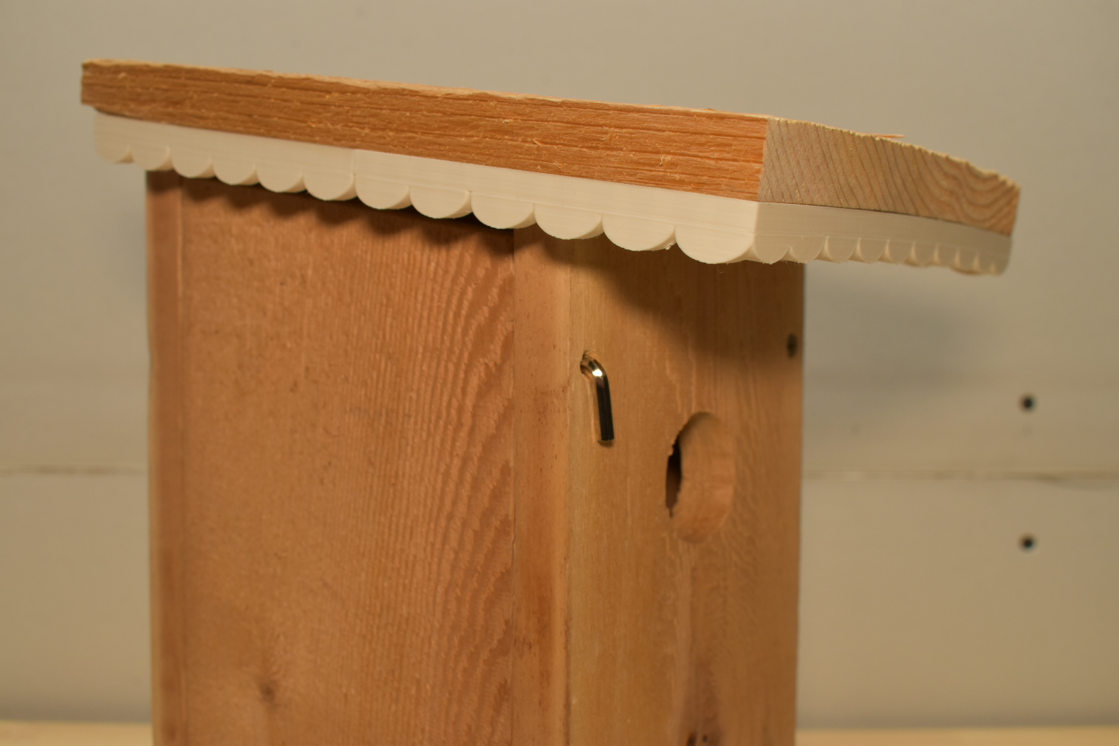 I recently built an Eastern Bluebird house. I used plans shared by the Oklahoma State University Extension Office, using their “Plan A” (Simplicity) design with 3/4" cedar boards. What I thought may be helpful in sharing was the 3D model design I created for having some white trim added to the roof of the house. I thought it would be nice to add a little character to the house, and we previously had a cottage house that has this type of looking trim. So, I thought I would share this if you also have bluebirds in your area, and are looking to provide them with a new home that has some charm.